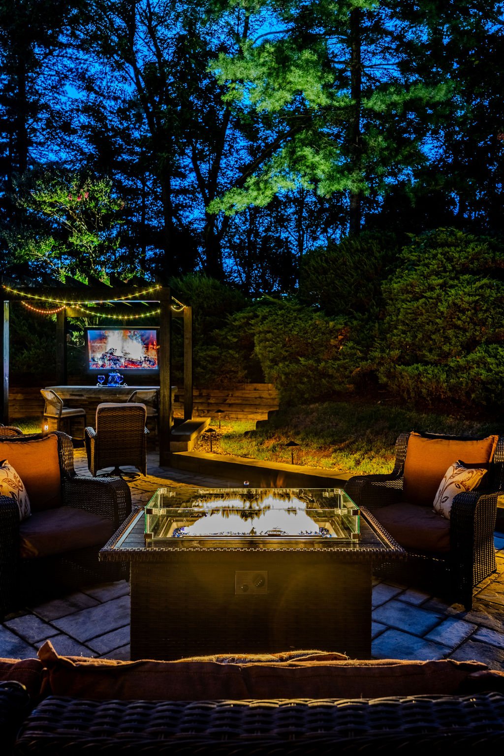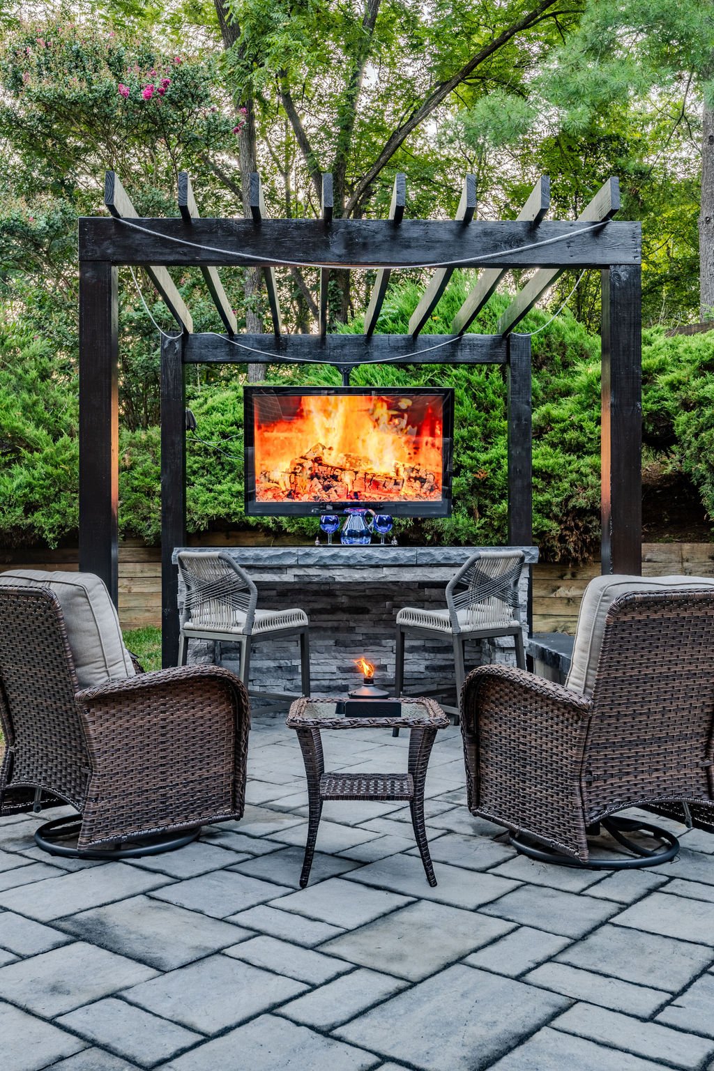Composite decks and patios are designed to be low maintenance. Wood structures may require periodic sealing, while features like firepits and kitchens only need standard cleaning.